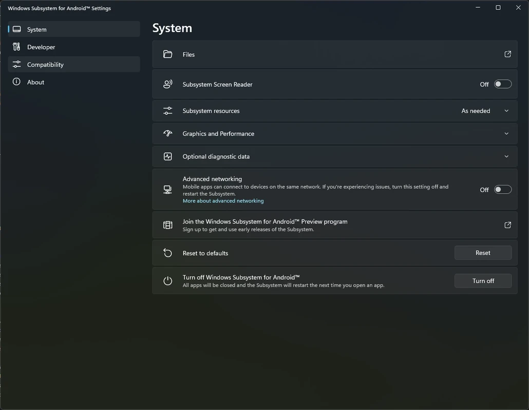 El Subsistema de Windows para Android es una aplicación de productividad desarrollada por Microsoft que emula oficialmente las aplicaciones de Android sin necesidad de instalar ninguna tienda. Microsoft ha interrumpido el soporte para el Subsistema de Windows para Android a partir de marzo de 2025, por lo que todas las aplicaciones compatibles, así como la App Store de Amazon, ya no podrán recibir soporte; solo se ofrece soporte técnico a los clientes.